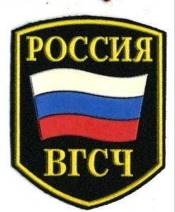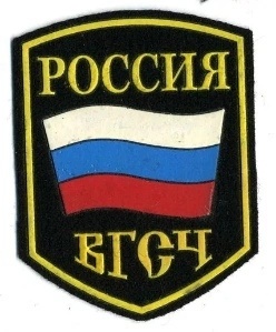 Нашивка представляет собой черный щит с желтой окантовкой. В верхней части нашивки золотыми буквами написано "РОССИЯ". В центре изображен флаг России, состоящий из трех горизонтальных полос: белой, синей и красной. В нижней части нашивки также золотыми буквами написано "ВГСО". Материал нашивки, вероятно, текстильный, что характерно для подобных знаков отличия. Дизайн простой и лаконичный, с использованием контрастных цветов для обеспечения хорошей видимости и узнаваемости.