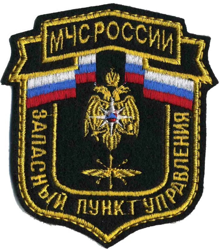 Нашивка изображает эмблему МЧС России (Министерства Российской Федерации по делам гражданской обороны, чрезвычайным ситуациям и ликвидации последствий стихийных бедствий). В центре нашивки изображен двуглавый орел – государственный символ России, выполненный золотой нитью. На груди орла – щит с изображением Георгия Победоносца, поражающего змея. Вокруг орла – ленты в цветах российского флага: белой, синей и красной. В верхней части нашивки надпись "МЧС РОССИИ", а в нижней – "ЗАПАСНОЙ ПУНКТ УПРАВЛЕНИЯ". Нашивка выполнена на темно-синем фоне с золотой окантовкой. Материал – вышивка на ткани.