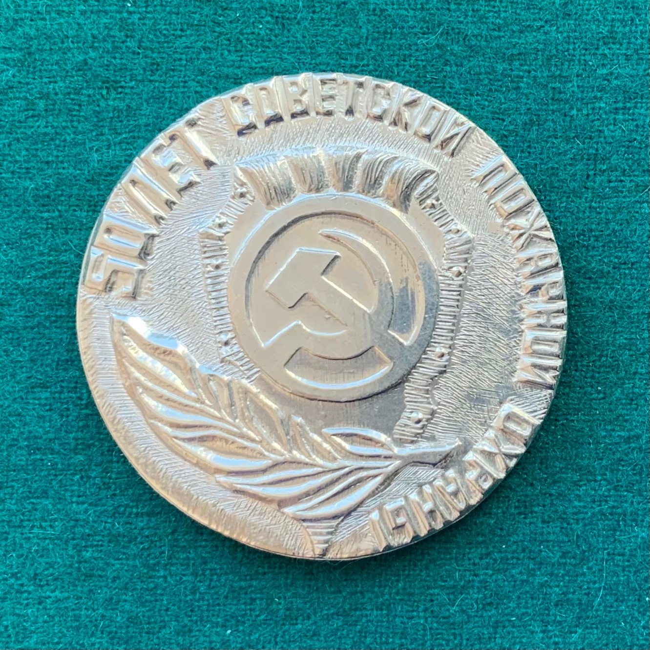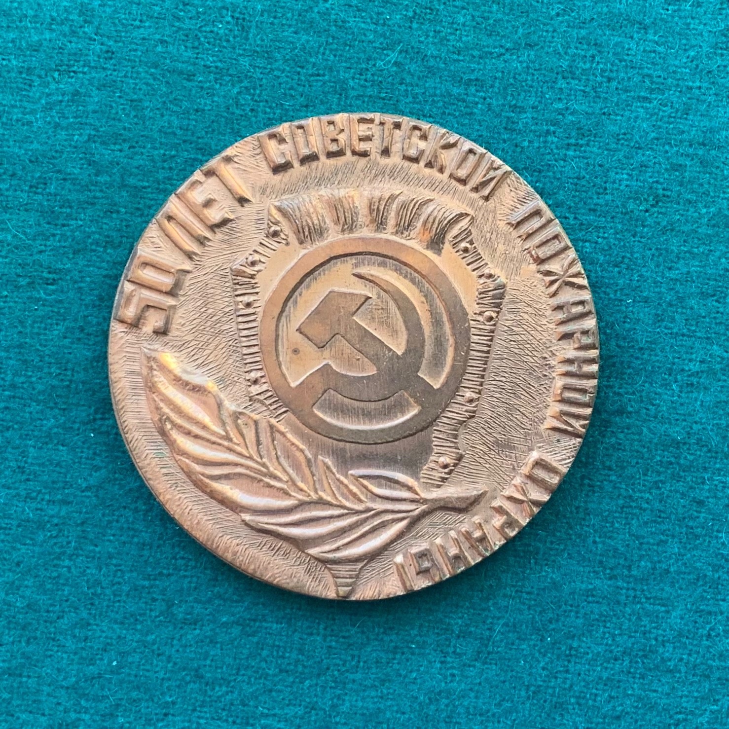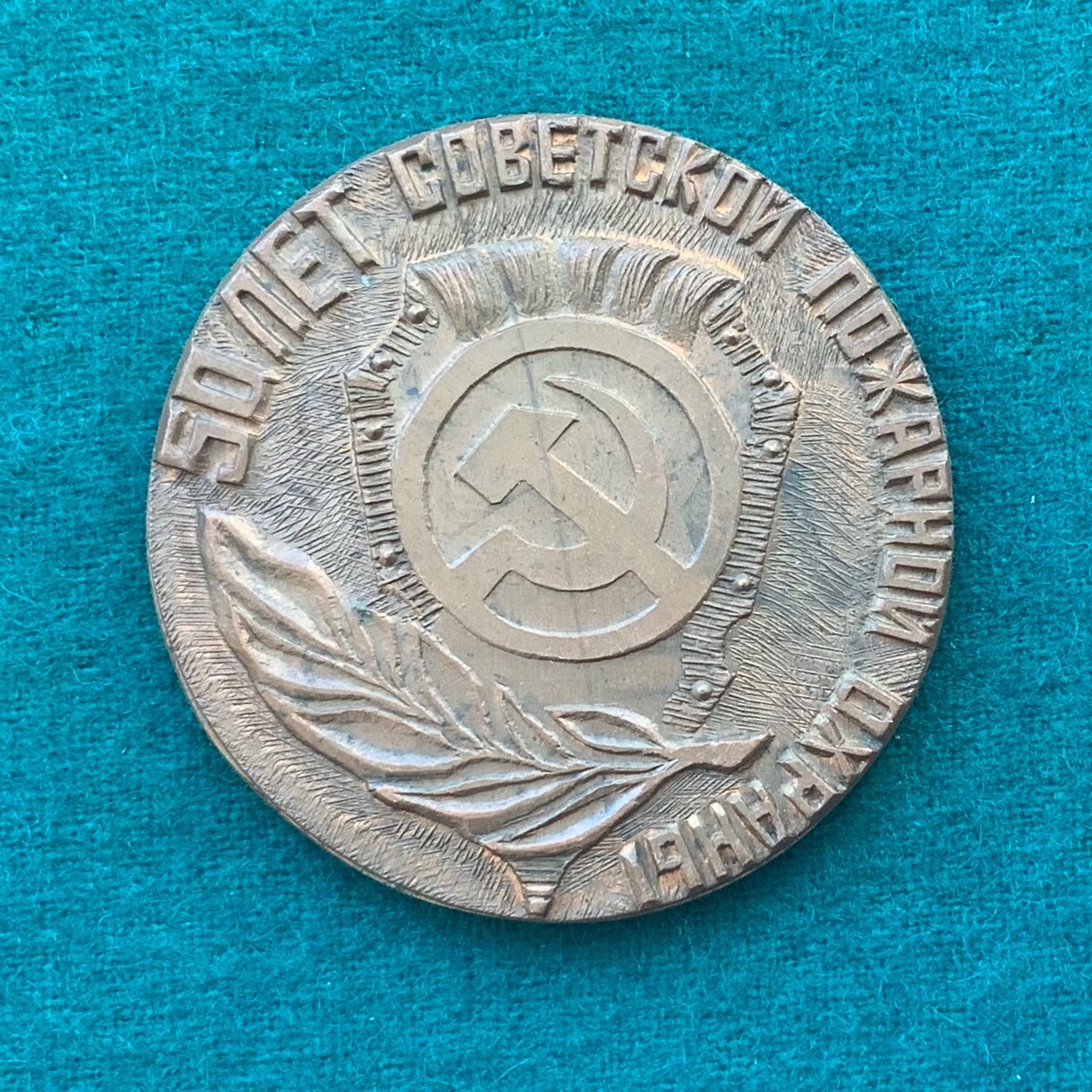 Настольная медаль «50 лет Советской пожарной охране» изготовлена из металла и имеет круглую форму. На лицевой стороне медали изображены серп и молот, символизирующие Советский Союз, окруженные лучами и лавровой ветвью, что подчеркивает значимость и почетность награды. Вокруг центрального изображения выгравирована надпись «50 лет Советской пожарной охране», что указывает на юбилейное значение медали. Дизайн медали выполнен в стиле, характерном для советских наград, с использованием рельефных элементов и четких линий. Медаль имеет серебристый цвет, что придает ей торжественный и благородный вид.