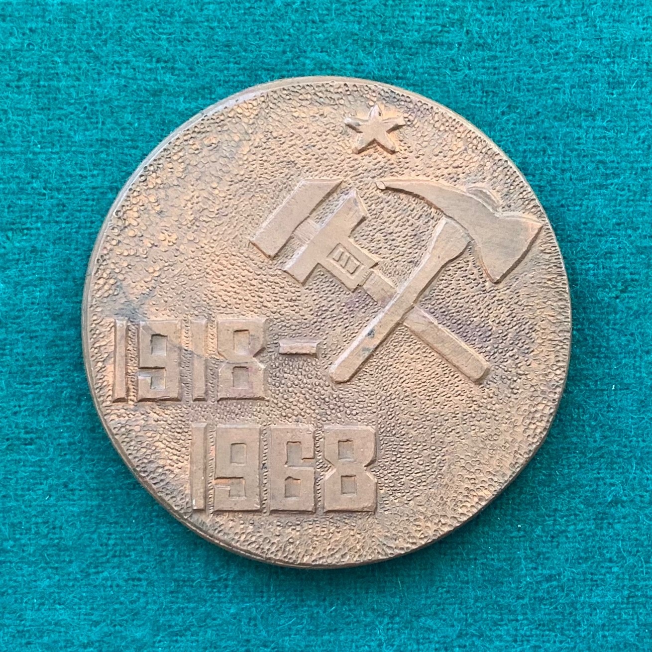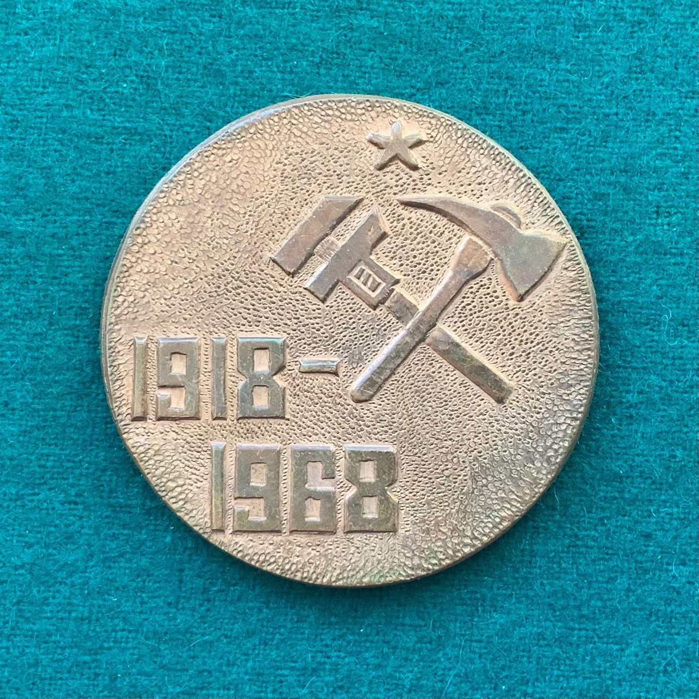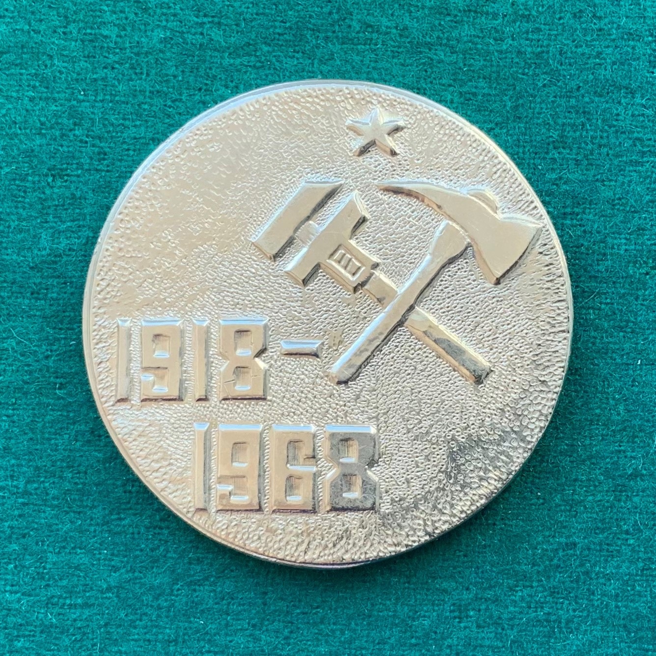 Настольная медаль «50 лет Советской пожарной охране» изготовлена из металла и имеет круглую форму. На лицевой стороне медали изображены серп и молот, символизирующие Советский Союз, окруженные лучами и лавровой ветвью, что подчеркивает значимость и почетность награды. Вокруг центрального изображения выгравирована надпись «50 лет Советской пожарной охране», что указывает на юбилейное значение медали. Дизайн медали выполнен в стиле, характерном для советских наград, с использованием рельефных элементов и четких линий. Медаль имеет серебристый цвет, что придает ей торжественный и благородный вид.