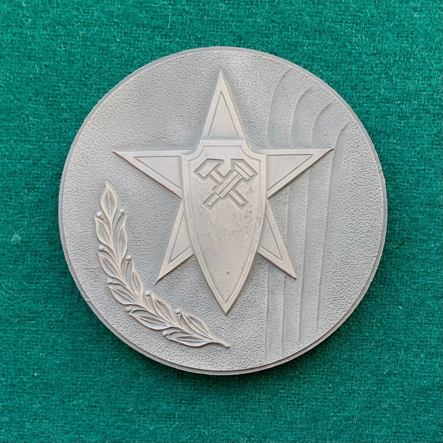 Настольная медаль, посвященная пожарной охране МВД СССР, изготовлена из металла. На лицевой стороне медали изображен герб, в верхней части которого расположен грузовик, символизирующий мобильность и оперативность пожарной службы. Под грузовиком изображены пожарный шлем, топор и брандспойт, перекрещенные между собой, что символизирует основные инструменты и атрибуты пожарных. Вокруг герба расположена надпись "МВД СССР" в верхней части и "Пожарная охрана" в нижней части. Медаль имеет круглую форму и выполнена в серебристом цвете. Фон медали имеет текстурированную поверхность, что придает ей дополнительный визуальный эффект.
