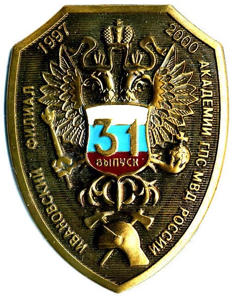 Это значок, посвященный выпуску 31-го курса Академии Государственной противопожарной службы МВД России за период с 1997 по 2000 год. Значок имеет форму щита и выполнен из металла с золотистым покрытием. В центре изображен двуглавый орел – государственный герб России, увенчанный короной. Под орлом расположен щиток с цифрой "31" и надписью "ВЫПУСК". В нижней части значка изображены скрещенные топор и каска, символизирующие пожарную службу. По краям значка выгравированы надписи: "АКАДЕМИЯ ГПС МВД РОССИИ" и годы "1997-2000". Цветовая гамма включает золотистый и красный цвета, что придает значку торжественный и значимый вид.