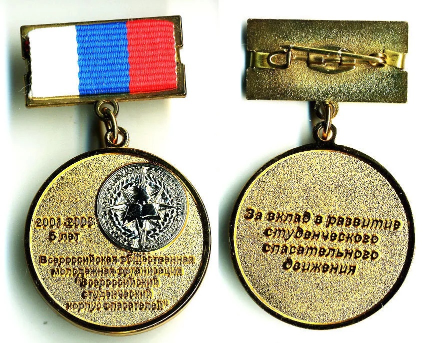 На изображении представлены две стороны одной медали, посвященной 5-летию Всероссийской общественной организации "Всероссийский студенческий корпус спасателей". Медаль изготовлена из металла и имеет круглую форму. На лицевой стороне изображена серебряная звезда с лавровым венком, а также надпись "2001-2006 5 лет Всероссийская общественная организация Всероссийский студенческий корпус спасателей". На оборотной стороне медали выгравирована надпись "За вклад в развитие студенческого спасательного движения". Медаль прикреплена к прямоугольной колодке, обтянутой лентой с тремя вертикальными полосами белого, синего и красного цветов. Колодка снабжена булавкой для крепления.