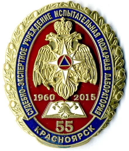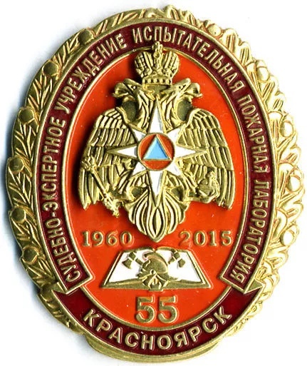 Это памятная медаль, посвященная 55-летию Судебно-экспертного учреждения Испытательной пожарной лаборатории в Красноярске. Медаль имеет овальную форму и выполнена из металла с эмалевым покрытием. Основной цвет медали — красный, с золотыми элементами.