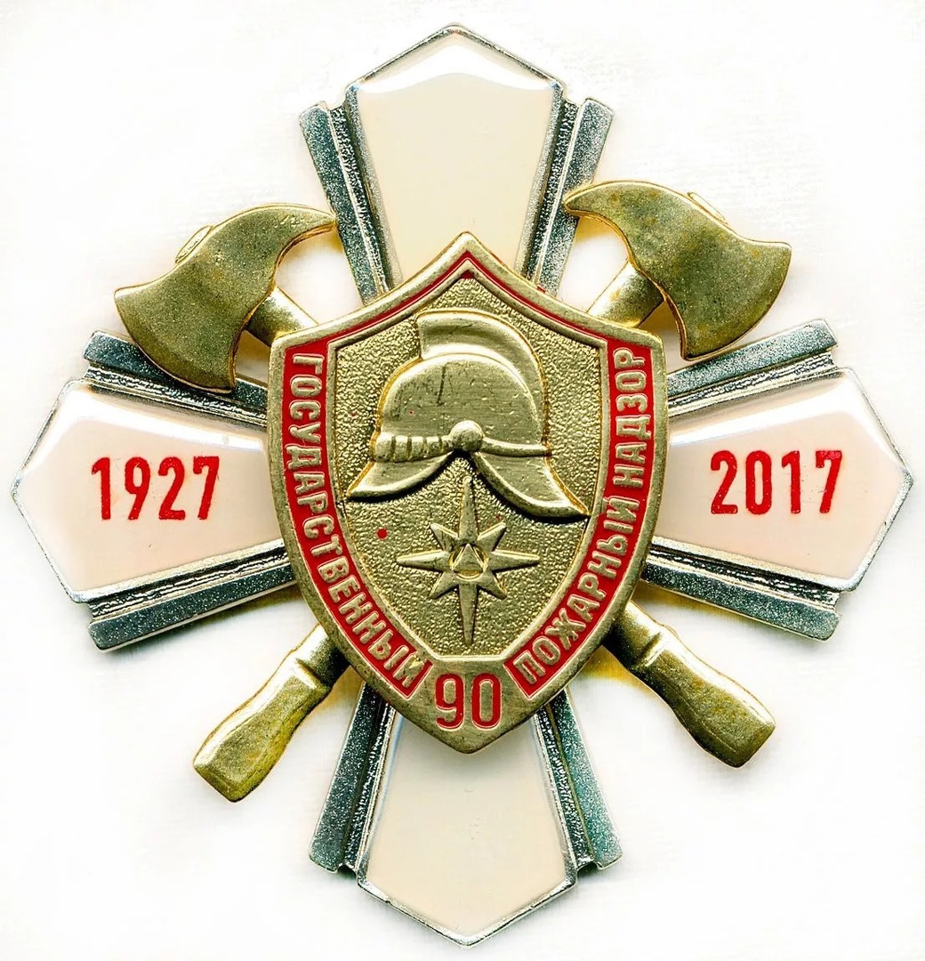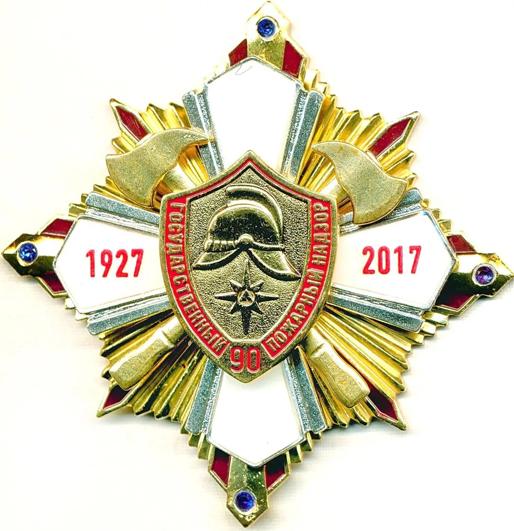Это знак, посвященный 90-летию Государственной противопожарной службы (ГПН) России, охватывающий период с 1927 по 2017 год. Центральный элемент знака – щит с изображением каски пожарного и звезды, символизирующей службу и героизм. Вокруг щита красная лента с надписью "90 лет ГПН 1927-2017". Знак выполнен в форме звезды с лучами, которые имеют золотой и серебряный оттенки, а также красные вставки. Материал знака, вероятно, металл с эмалевыми вставками. Цвета знака – золото, серебро, красный и белый – подчеркивают его торжественный и почетный характер.