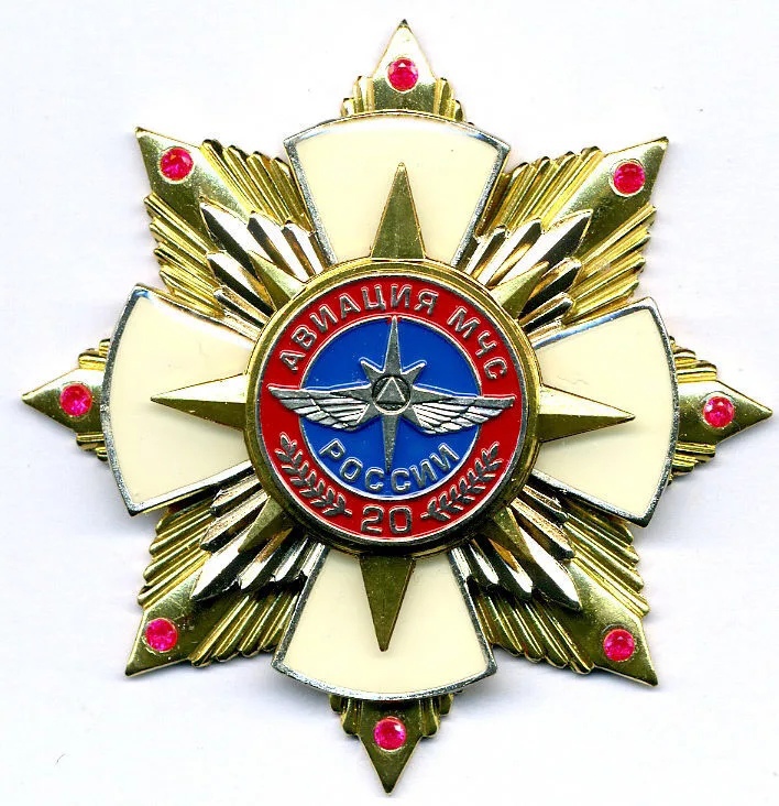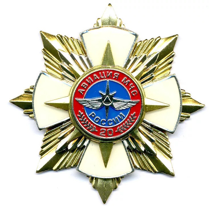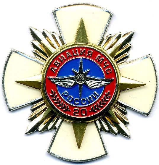 Это знак, посвященный 20-летию авиации МЧС России. Знак имеет форму креста с синими и золотыми элементами. В центре знака изображена красная окружность с надписью "АВИАЦИЯ МЧС РОССИИ" и "20 ЛЕТ". Внутри окружности изображена серебряная звезда с крыльями, символизирующая авиацию. Знак выполнен из металла и покрыт эмалью. Вокруг центральной окружности расположен золотой лавровый венок, что придает знаку торжественный и почетный вид.