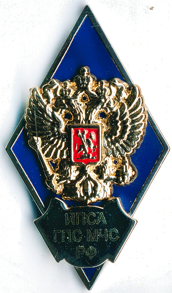 Это значок, изображающий герб Российской Федерации. Значок выполнен в форме ромба с белым фоном и черной окантовкой. В центре значка расположен двуглавый орел, выполненный в золотистом цвете. На груди орла изображен красный щит с изображением всадника, поражающего копьем дракона. Под орлом расположена синяя лента с надписью "ИПСА ГПС МЧС РФ" золотистыми буквами. Материал значка, вероятно, металл с эмалевым покрытием. Значок символизирует принадлежность к МЧС России (Министерству Российской Федерации по делам гражданской обороны, чрезвычайным ситуациям и ликвидации последствий стихийных бедствий).