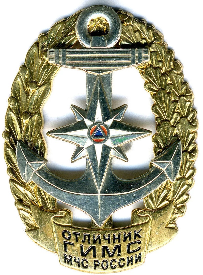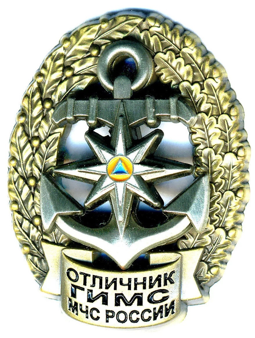 Это знак "Отличник ГИМС МЧС России". Знак выполнен в форме овала, обрамленного золотым лавровым венком. В центре знака изображена серебряная якорь, на которую наложена восьмиконечная звезда. В центре звезды расположен маленький треугольник с красной и синей эмалью. В верхней части знака изображен якорный шток, а в нижней части на ленте выгравирована надпись "ОТЛИЧНИК ГИМС МЧС РОССИИ". Знак изготовлен из металла и имеет золотистый и серебристый цвет.