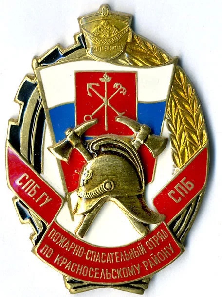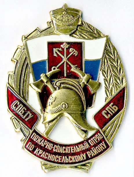 Это значок, посвященный пожарно-спасательному отряду Красное Село. Значок выполнен в форме щита, обрамленного золотыми лавровыми ветвями. В центре щита изображена каска пожарного, скрещенная с топором и ключом, что символизирует профессию и обязанности пожарных. Над каской изображены ключи, перекрещенные на красном фоне, что может символизировать ключи к безопасности. В верхней части щита изображена корона, указывающая на статус или значимость отряда. В нижней части значка красная лента с надписью "ПОЖАРНО-СПАСАТЕЛЬНЫЙ ОТРЯД ПО КРАСНОСЕЛЬСКОМУ РАЙОНУ". Цвета значка включают красный, синий, белый и золотой, что придает ему торжественный и патриотический вид.