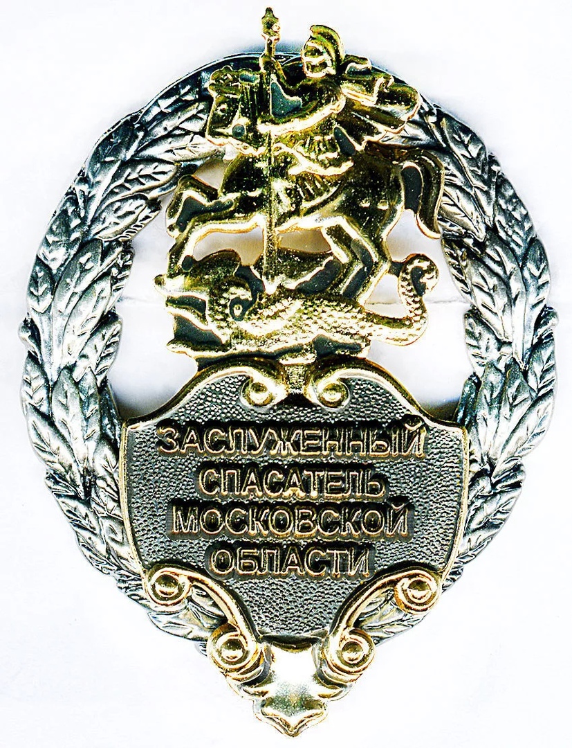 Награда, изображенная на изображении, представляет собой знак «Заслуженный пожарный Московской области». Знак выполнен из металла и имеет форму щита, обрамленного лавровым венком. В верхней части знака изображен всадник, поражающий копьем дракона, что символизирует борьбу с огнем и опасностью. В нижней части знака на щите выгравирована надпись на русском языке: «ЗАСЛУЖЕННЫЙ ПОЖАРНЫЙ МОСКОВСКОЙ ОБЛАСТИ». Лавровый венок, обрамляющий щит, выполнен в серебристом цвете, а сам щит и всадник – в золотистом. Знак имеет рельефную текстуру, что придает ему дополнительную выразительность и значимость.