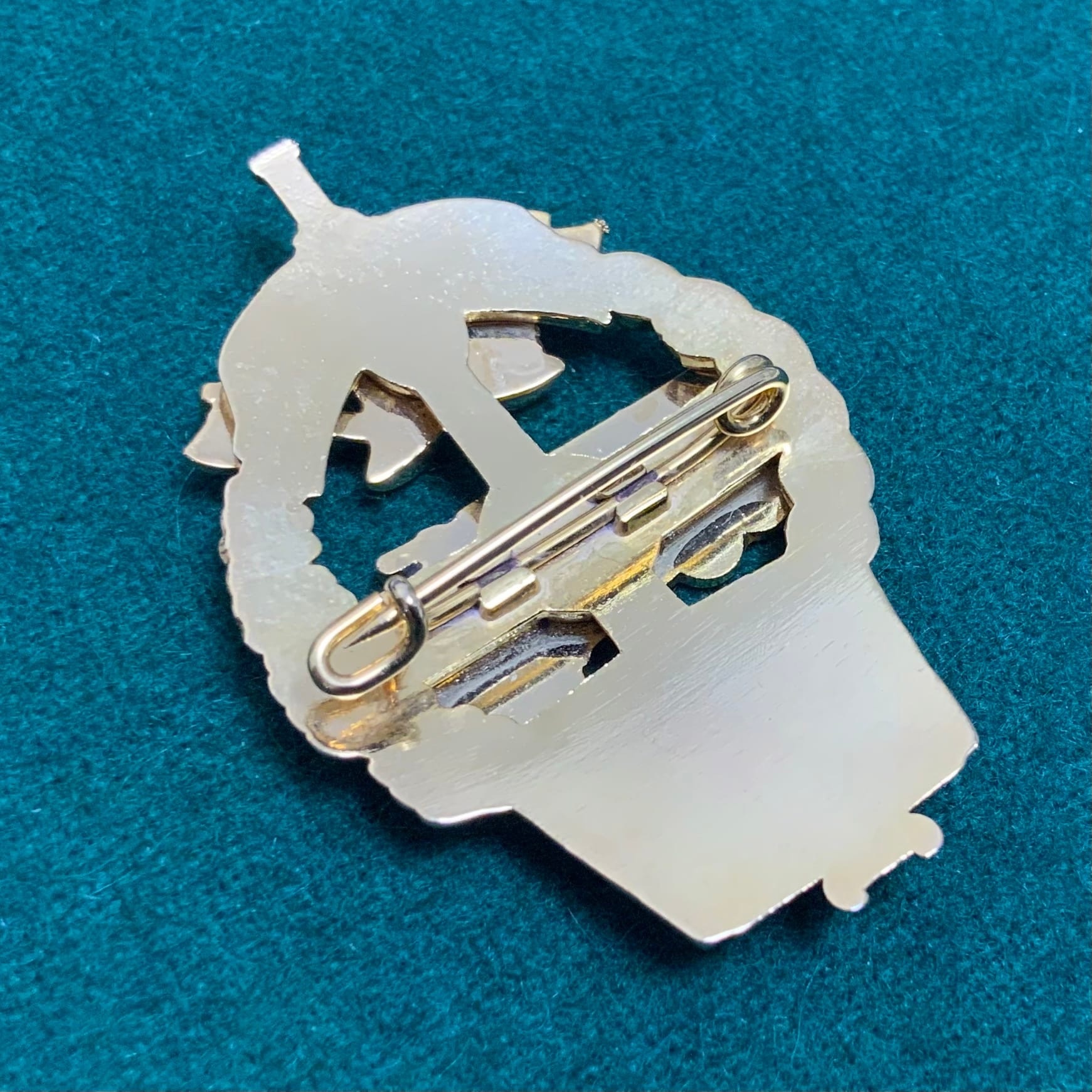 На изображении представлен знак "Кафедра пожарной техники Академии ГПС МЧС России". Знак выполнен из металла и имеет форму щита, обрамленного лавровым венком. В верхней части знака изображена каска пожарного с двумя перекрещенными топорами на фоне российского триколора. Ниже каски изображен красный пожарный автомобиль. В нижней части знака на красном фоне золотыми буквами выгравирована надпись "КАФЕДРА ПОЖАРНОЙ ТЕХНИКИ АКАДЕМИИ ГПС МЧС РОССИИ". Цвета знака включают золото, красный, белый и синий. Знак символизирует принадлежность к кафедре пожарной техники и отражает профессиональную гордость и достижения в области пожарной безопасности.