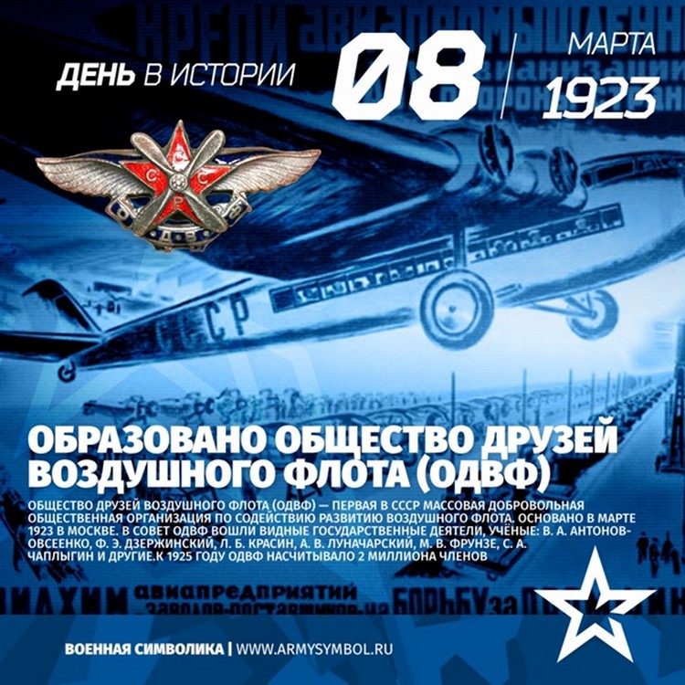 8 марта 1923 года в Москве состоялось собрание, посвященное учреждению массовой организации трудящихся - Общества друзей воздушного флота (ОДВФ), цель которого заключалась в пропаганде авиации и оказании материальной и иной помощи в создании отечественной авиации и авиационной промышленности, а также в привлечении молодежи к занятиям авиамоделизмом, планеризмом и авиационным спортом, подготовке кадров летчиков. Лозунгом ОДВФ был призыв: «Трудовой народ, строй воздушный флот!»