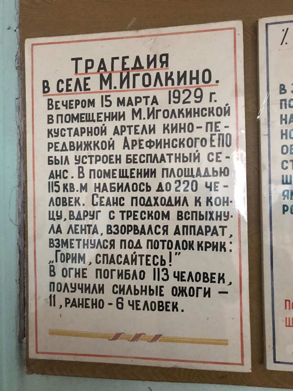 15 марта 1929 года в селе Малое Иголкино (Нижегородская обл.) произошел крупнейший и самый страшный пожар в СССР в 1920-е гг. Во время празднования Масленицы в здании местной кустарной артели кинопередвижкой был устроен бесплатный киносеанс. В маленькое здание набилось 220 (!) человек, причем на окнах стояли решетки, а внутри валялся мусор. К концу сеанса пьяный киномеханик, докурив папиросу, бросил ее в кучу мусора, из-за чего пламя начало разгораться. Среди зрителей началась паника, переросшая в давку. В трагедии погибли 114 человек, еще 17 получили тяжелые и легкие ожоги. Сам киномеханик успел скрыться от возмездия. Вскоре по обвинению в ведении подрывной деятельности (в том числе в пожаре) были обвинены 7 местных священников, которые по приговору суда были казнены.