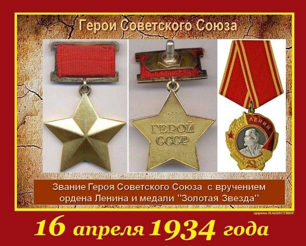 16 апреля 1934 г. было принято постановление Центрального Исполнительного Комитета СССР «Об установлении высшей степени отличия — звания Героя Советского Союза».