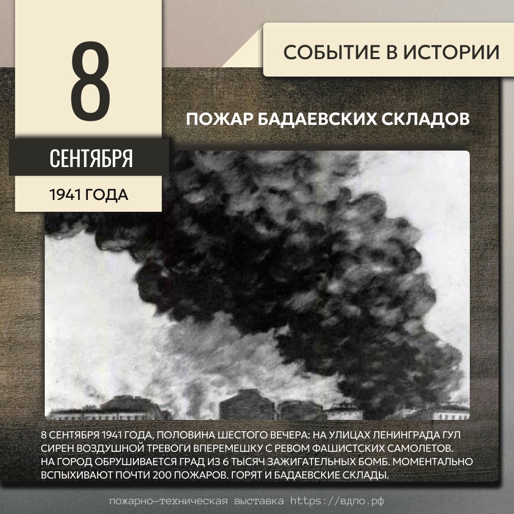 8 сентября 1941 года, половина шестого вечера: на улицах Ленинграда гул сирен воздушной тревоги вперемешку с ревом фашистских самолетов. На город обрушивается град из 6 тысяч зажигательных бомб. Моментально вспыхивают почти 200 пожаров. Горят и Бадаевские склады. Тушить огонь фактически некому — из 38 человек местной пожарной команды с огнём борются меньше половины: одних отправили рыть окопы, другие просто не смогли пройти к складам — у людей не было пропуска для передвижения по городу при воздушной тревоге.
