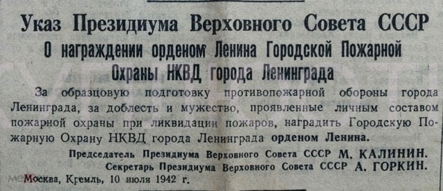 За образцовую подготовку противопожарной обороны города Ленинграда, за доблесть и мужество, проявленные личным составом пожарной охраны при ликвидации пожаров, наградить городскую пожарную охрану НКВД города Ленинграда орденом Ленина.