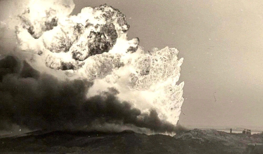 Но гораздо больше мне запомнилось другое зрелище. Наша колонна еще не добралась до Красного Яра, а высоко над горизонтом стало уже отчетливо видно ярко-рыжее зарево, постепенно растущее и закрывающее собой половину небо. Потом мы увидели, что по мере приближения к горящей буровой снежный покров заметно уменьшался, а в километре от ревущего фонтана из-под снега уже были видны замерзшие земляные кочки после осенней пахоты. К моменту нашего прибытия в радиусе километра от горящей скважины снеговой покров исчез почти полностью. Нас всех оглушил шум и гул бурлящего огненного фонтана, который нарастал по мере приближения к нему, причем в воздухе ощущалось заметное потепление. Когда же после 30-тиградусного мороза мы, наконец, вступили на теплую, а местами и вовсе горячую землю, то в некоторых местах заметили пробивающиеся наружу зеленые травинки. Такой оказалась сила теплового излучения, идущего со стороны пылающего нефтяного факела»