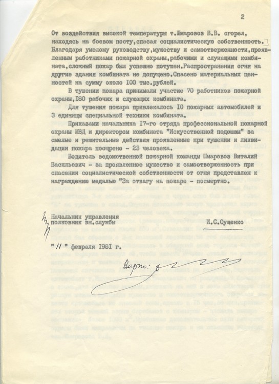 Водитель пожарной команды, Виталий Васильевич Шмаровоз, проявил героизм: он попытался вывести машину из огня, двигаясь на ней через густой огонь, рискуя жизнью.