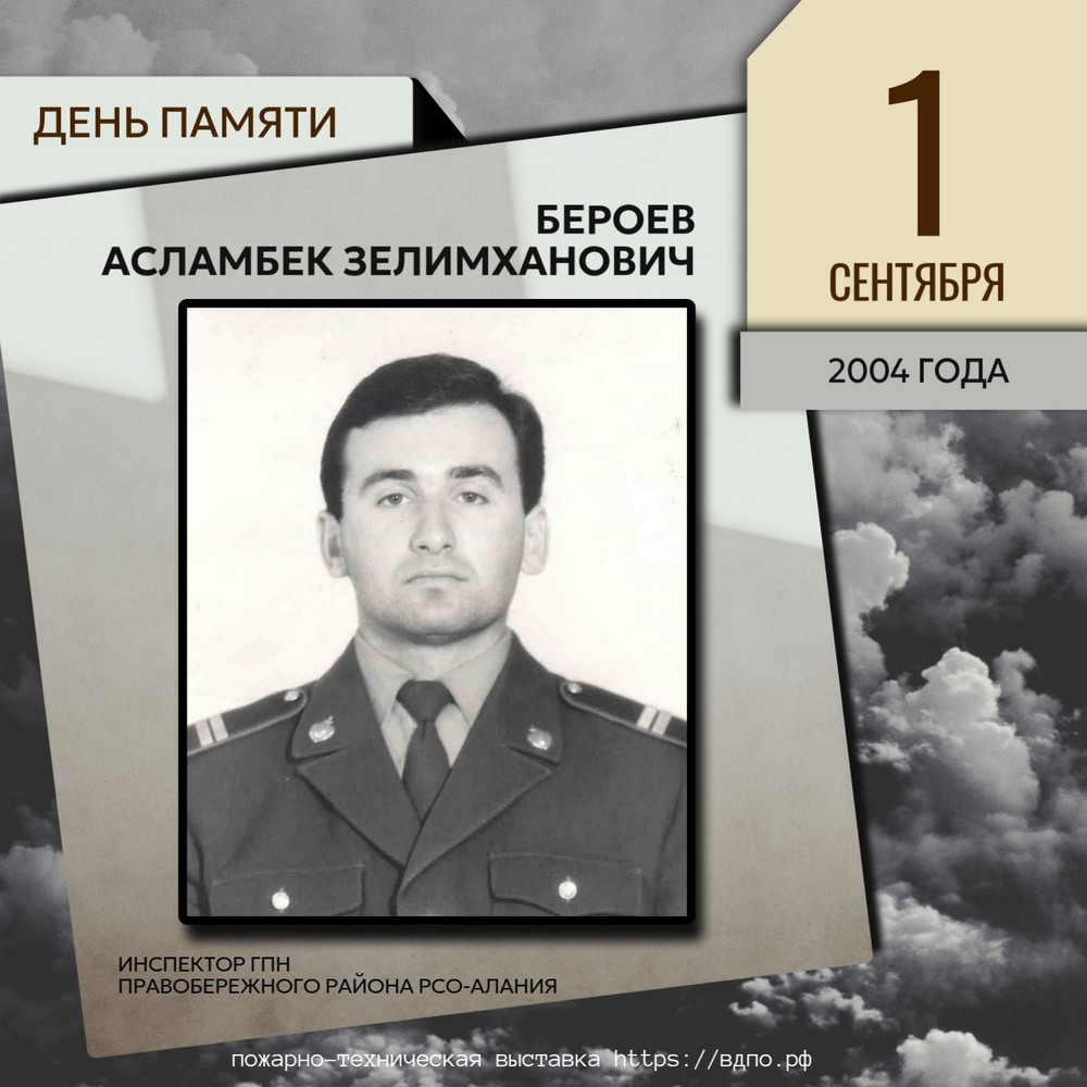 Бероев Асламбек Зелимханович должен был проводить 1 сентября 2004 года занятия по вопросам пожарной безопасности с учащимися средней школы № 1 г. Беслана. Готовился к мероприятию как на парад. Намеревался рассказать детишкам своего родного района многое. Хотел, что бы непоправимые горькие уроки пожаров в школах Якутии и Дагестана больше никогда не повторились.