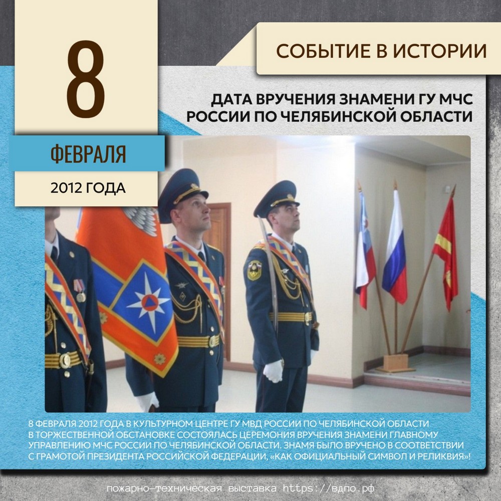 8 февраля 2012 года в Культурном центре ГУ МВД России по Челябинской области в торжественной обстановке состоялась церемония вручения знамени Главному управлению МЧС России по Челябинской области. Знамя было вручено в соответствии с Грамотой Президента Российской Федерации, «как официальный символ и реликвия»! В церемонии приняли участие начальник Уральского регионального центра МЧС России генерал-лейтенант Юрий Валентинович Нарышкин, начальник ГУ МЧС России по Челябинской области генерал-майор Олег Борисович Климов, почётные гости и личный состав Главного управления.