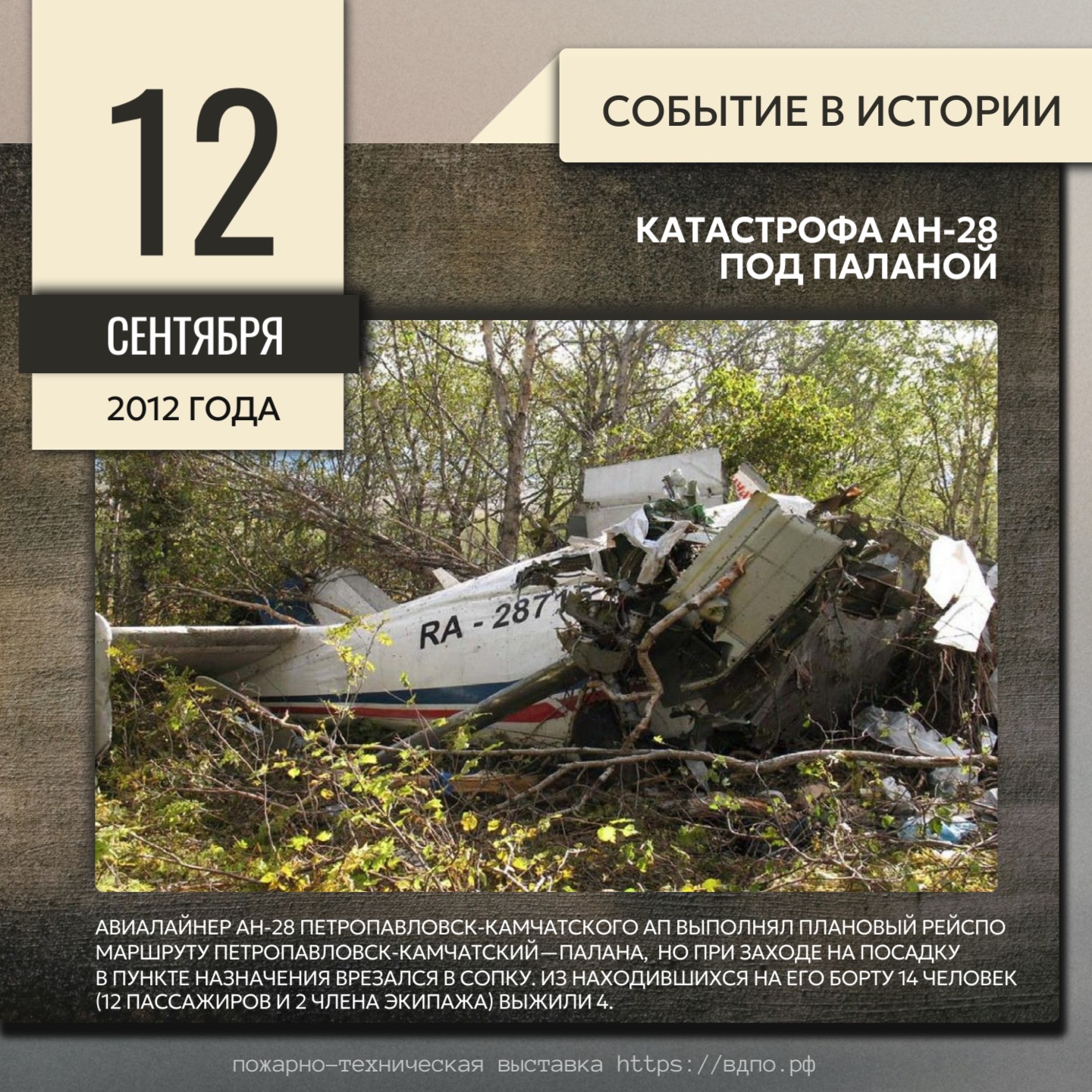 Самолёт Ан-28 с бортовым номером RA-28715, принадлежащий Петропавловск-Камчатскому авиапредприятию Камчатского МТУ ВТ ФАВТ, выполнял рейс по маршруту Петропавловск-Камчатский — Палана. В 04:28 по московскому времени с самолётом пропала связь. Около 06:00 спасательный вертолёт обнаружил самолёт на склоне горы Пятибратка на высоте около 200 м в 10 км от аэропорта Палана полностью разрушенным. Погибли 10 человек из 14, находившихся на борту самолёта. Все выжившие были выброшены из хвостовой части самолёта после удара о землю, все они получили ранения различной степени тяжести.