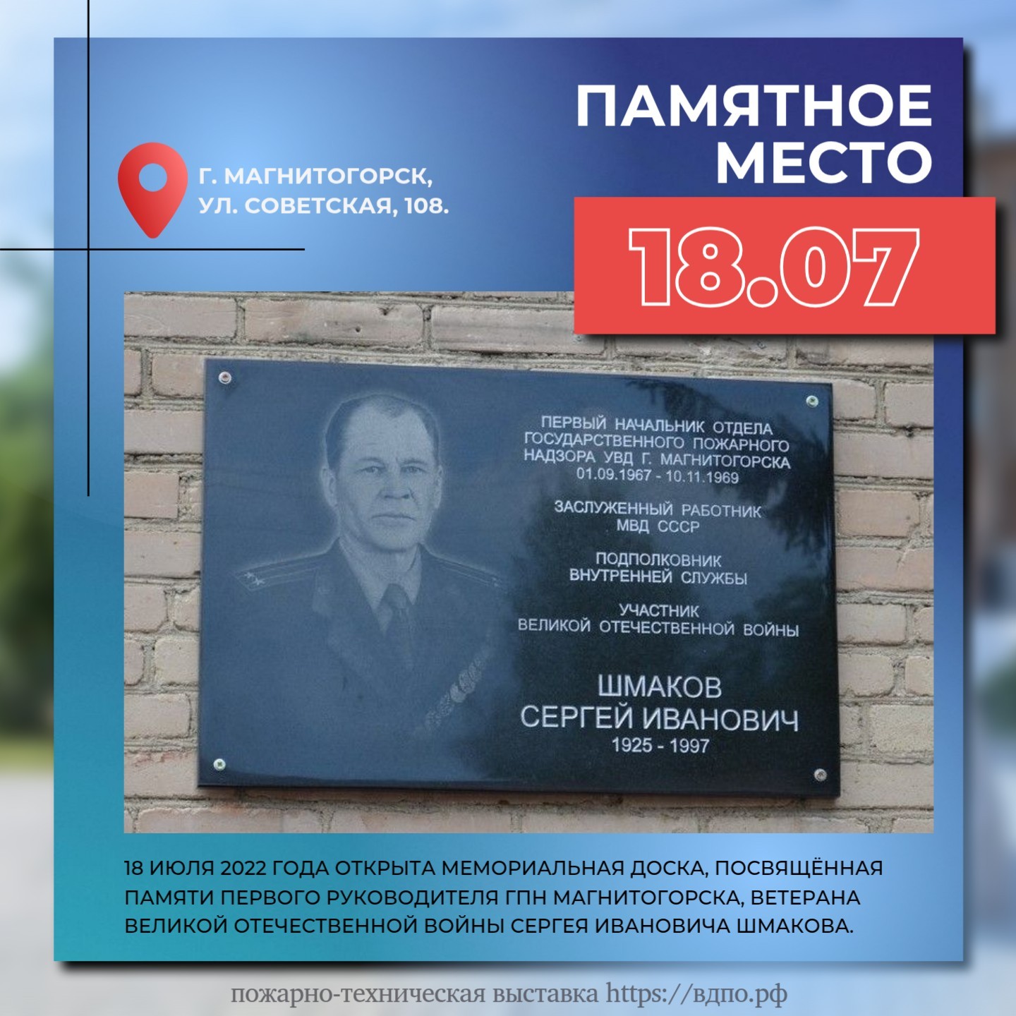 18 июля 2022 года в Магнитогорске прошло торжественное мероприятие, приуроченное к 95-летию органов государственного пожарного надзора России. В ходе встречи чествовали виновников торжества – инспекторов и дознавателей. Но, вместе с этим было организовано весьма знаменательное событие как для сотрудников госпожнадзора, так и для всего Магнитогорского гарнизона в целом: была открыта мемориальная доска, посвящённая памяти первого руководителя ГПН Магнитогорска, ветерана Великой Отечественной войны Сергея Ивановича Шмакова.