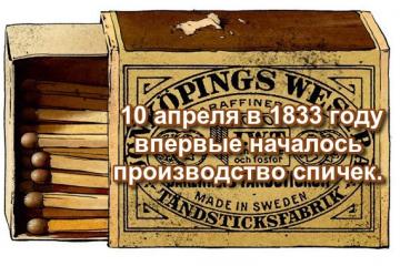 Выражение «Спички - детям не игрушка!» знает каждый, но не каждый знает, что именно сегодня, 10 апреля, день рождения спички. На определенном этапе развития человечества огонь сыграл немаловажную роль, и потому его добыча стала для людей жизненно необходимой. Немалое число...
