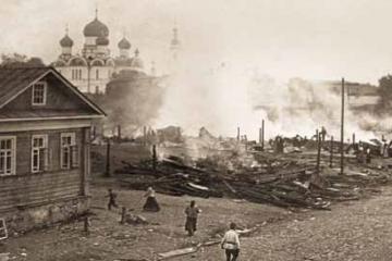 21 апреля в 4.30 часа дня одновременно в трех местах центральной части города вспыхнул пожар , быстро превративший весь центр города в стихийное море огня. Горели здания на площади Коммуны, начиная от угла Московской улицы и кончая зданием Нардома; вспыхнули и были охвачены пламенем...