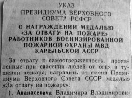 Когда в мае 1962 года в газете был опубликован Указ Президиума Верховного Совета РСФСР о награждении петрозаводских пожарных медалью «За отвагу на пожаре», - вспоминает сын ветерана, Андрей Георгиевич Архипов, - и отцу вручили эту высокую награду, мне шел всего шестой год. Но хорошо помню ту праздничную атмосферу, которая тогда творилась у нас в доме. Я гордился своим отцом. А один раз я стащил отцову медаль и хвастался ее перед мальчишками по двору. Тогда и предположить не мог, что пройдет время, и я на боевом посту в пожарной охране сменю своего отца.