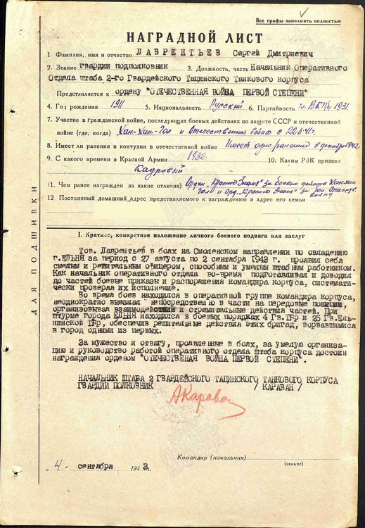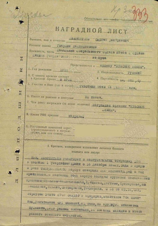 С мая по сентябрь 1939 года старший лейтенант Лаврентьев участвовал в боях на реке Халхин-Гол, был награжден орденом Красного Знамени. 28 января 1940 года Сергей Дмитриевич был назначен командиром танковой роты 14-го танкового полка 15-й моторизованной дивизии, в составе подразделения принимал участие в освободительном походе РККА на территорию Бессарабии. С 27 мая 1940 года – начальник полковой школы 14-го отдельного танкового полка. С февраля 1941 года старший лейтенант Лаврентьев – начальник 1-го отделения штаба 16-го танкового полка 16-й танковой дивизии 2-го механизированного корпуса.