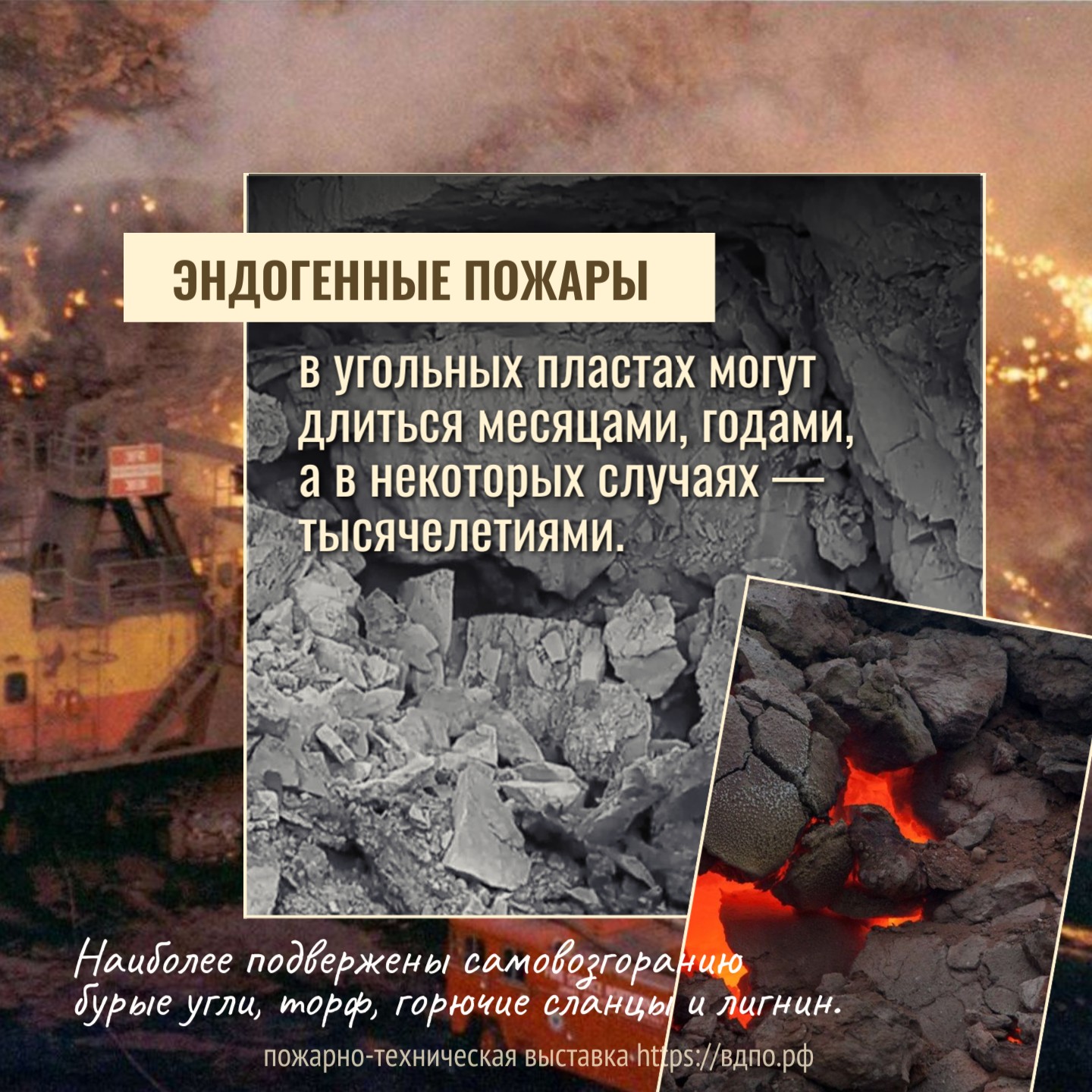 Эндогенные пожары в угольных пластах могут длиться месяцами, годами, а в некоторых случаях — тысячелетиями. Например, в Австралии находится «Горящая гора» — самое старое из известных месторождений угля, где пожар продолжается уже около 6000 лет.