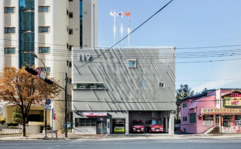 Архитекторы Yong Ju Lee Architecture превратили обычное пожарное депо в произведение искусства. Фасад здания украшен жалюзи с динамичным рисунком, символизирующим скорость пожарных машин. Внутри продумана каждая деталь: от быстрых спусков для экстренных вызовов до зон отдыха, включая тренажерный зал, сад на крыше и комфортные спальни.