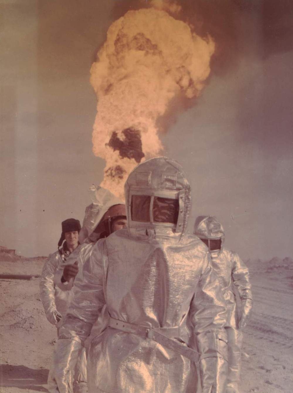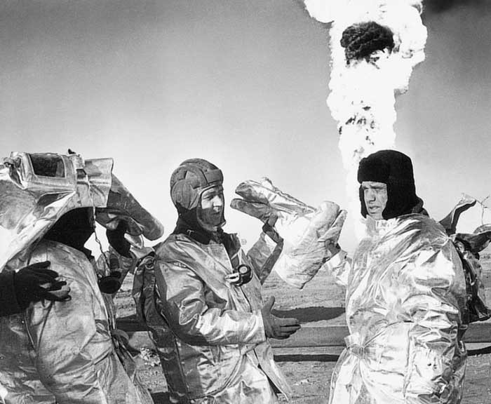 При ликвидации газонефтяного фонтана на Тенгизе проходил испытания новый теплоотражательный материал – асбестофиниловую ткань. Отрезки материала нашивали на места возможных прогаров существовавшей тогда спецодежды пожарных и на расстоянии 4 метров от устья скважины проверяли в течение трех минут.