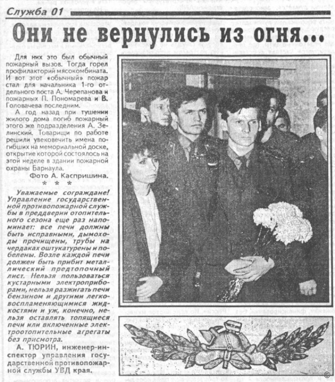 Они сдержали распространение огня до прибытия дополнительных сил и средств гарнизона, обеспечили им успешное тушение, но сами погибли. От взрыва. Этот трагический случай стал поводом для ежегодных памятных мероприятий в Барнауле, где родственники, коллеги и спасатели чтят память погибших героев.