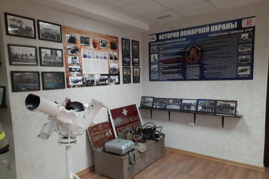 В комнате воинской и трудовой славы собраны экспонаты пожарно-технического вооружения, средства связи, средства индивидуальной защиты органов дыхания и зрения, боевое снаряжение пожарного, форменная одежда, вещественные доказательства с мест возникновения пожара, пожарный насос в разрезе, кубки, медали, грамоты призовых мест Главного управления, стенды с историей пожарной охраны МЧС России по КЧР и фотографии ветеранов пожарной охраны, также в комнате размещены детские рисунки на тематику пожарной охраны.