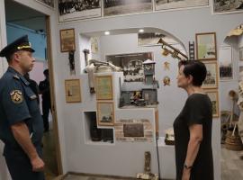 1) история пожарной службы представлена – 4 настенных стенда, пожарный колокол, ручной насос (19 век), конно-бочечный обоз на подиуме