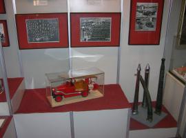 На подиуме размещены экспонаты с мест пожаров, пожарно – техническое вооружение, макеты пожарных автомобилей и детские поделки на противопожарную тему.