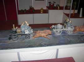 На подиуме размещены: пожарное вооружение, колокола, макет пожарной каланчи, макет пожарного депо, просуществовавшего до 1950 года, макет автомобиля «АМО - Ф - 15» , маска Кенига, копии исторических документов, диорама «Пожар на Базарной площади 1924 года», макет конного обоза, макет «Квартира до и после пожара».