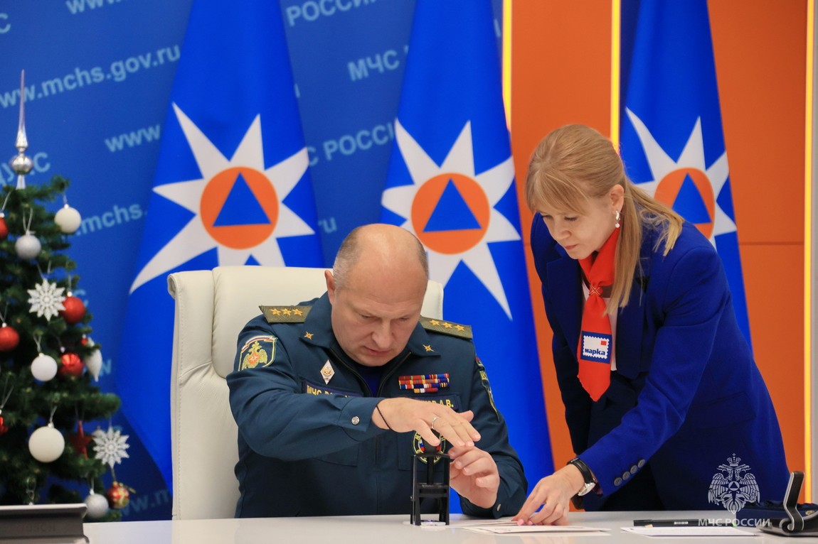 Первые лица МЧС России Александр Куренков и Акционерного общества «Марка» Вероника Максименкова поставили оттиски на 8 художественных маркированных конвертах с литерой «А».
