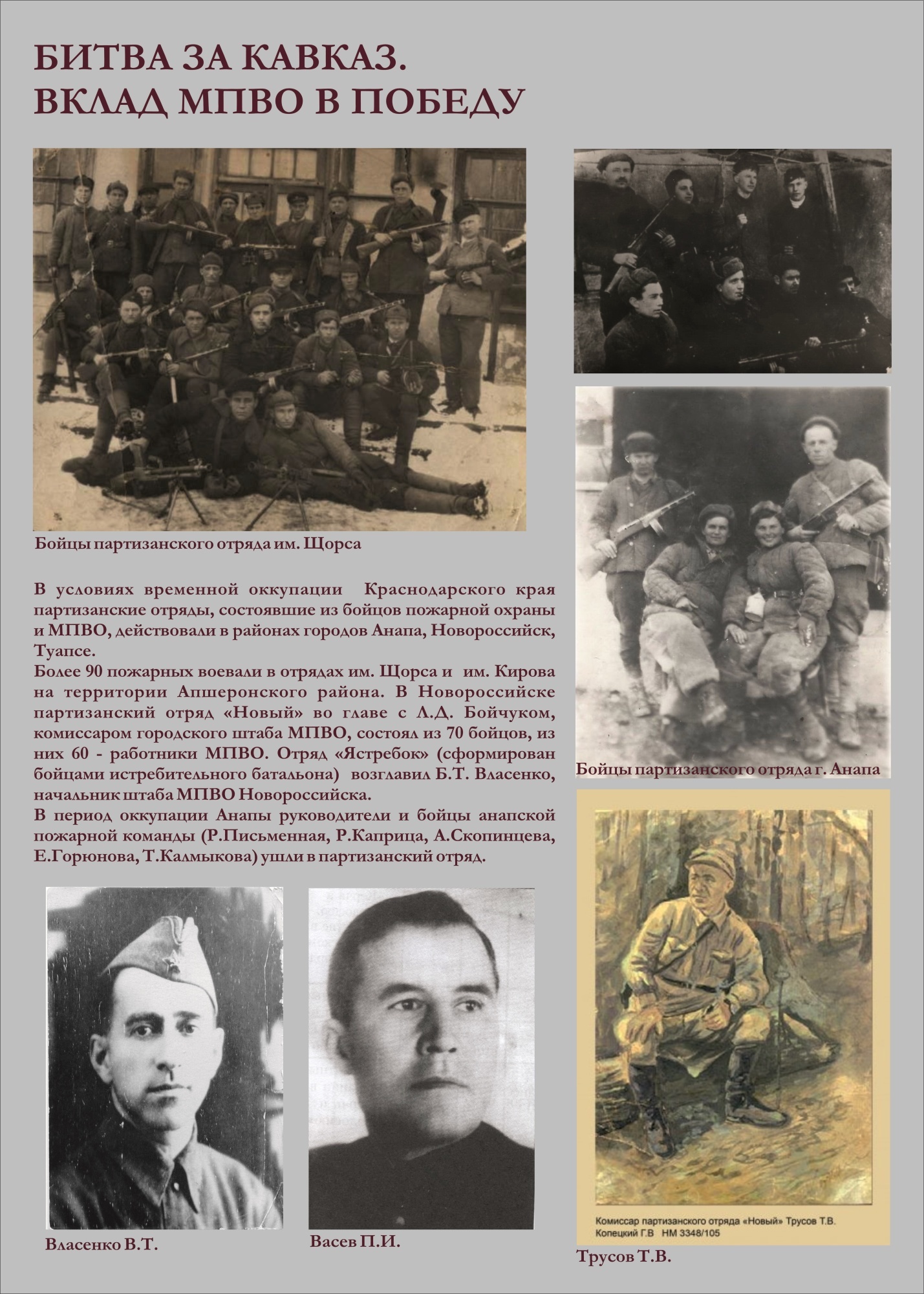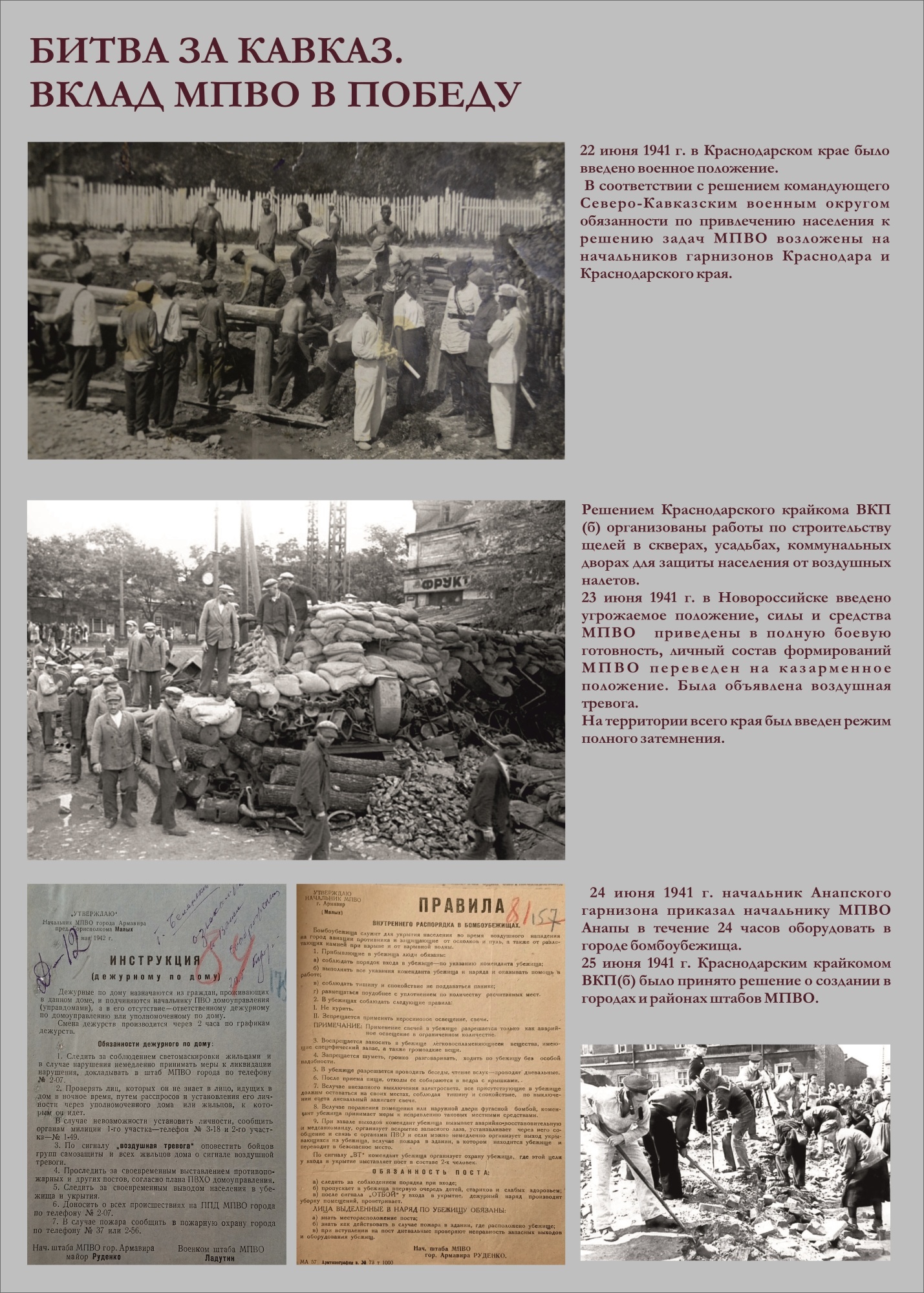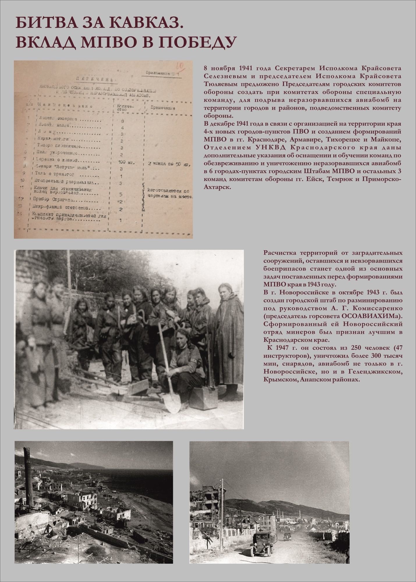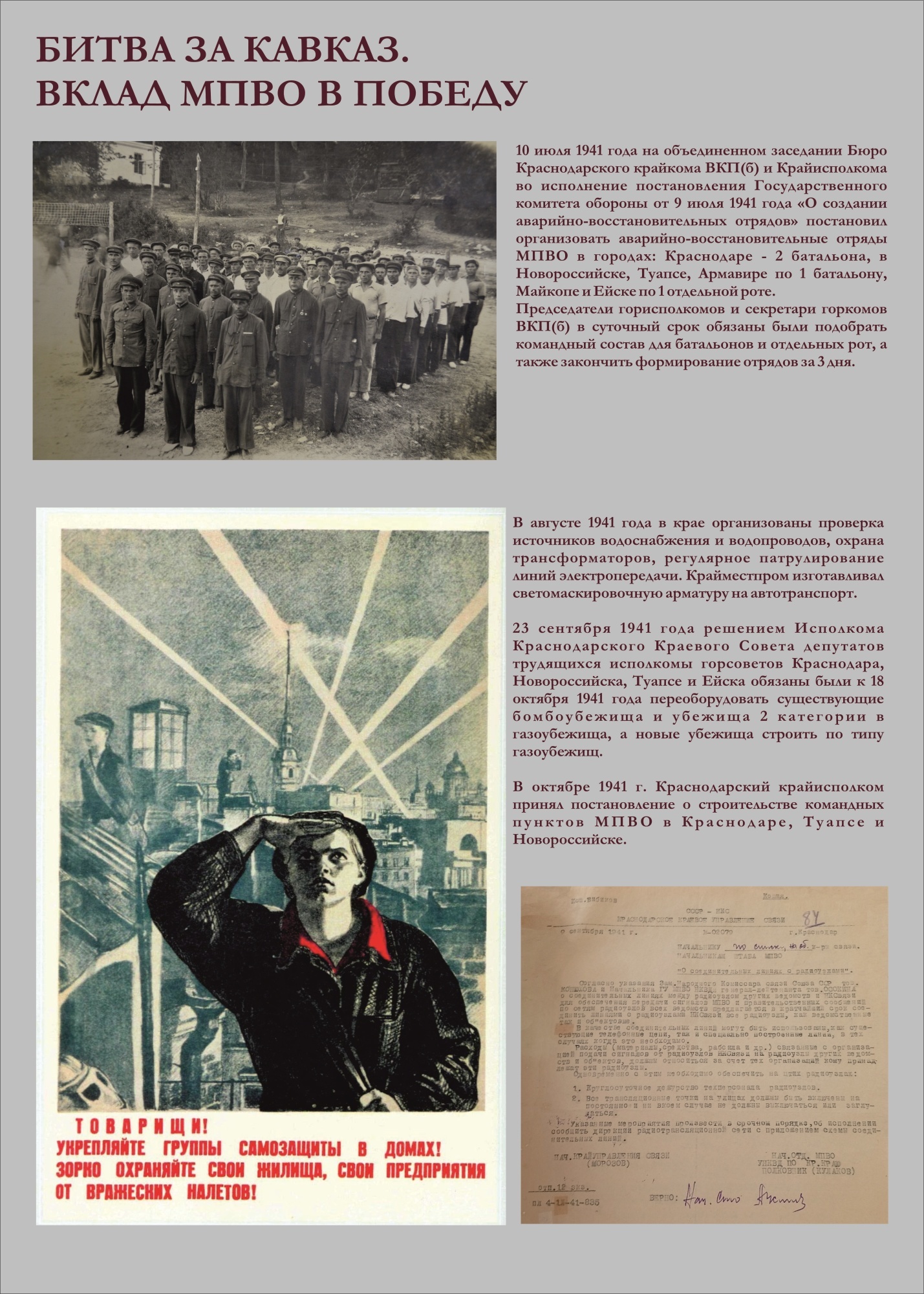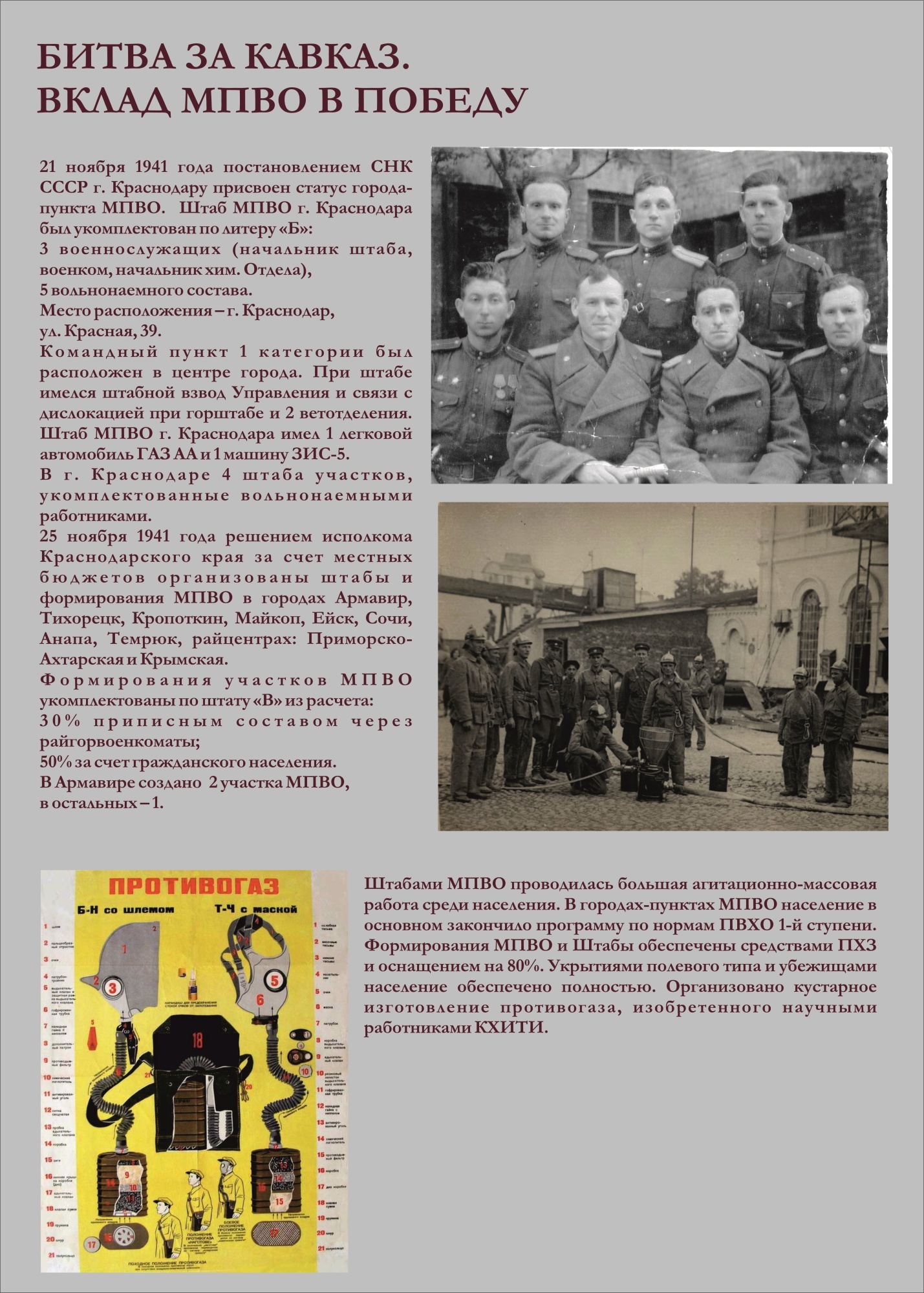 Сотрудники Краснодарской краевой пожарно-технической выставки МЧС России в честь 80-летия Победы в Великой Отечественной войне создали экспозицию «Битва за Кавказ. Вклад МПВО в Победу». В основу легли архивные фотографии и текстовые материалы, иллюстрирующие боевые будни местной противовоздушной обороны Краснодарского края в период противостояния немецко-фашистским захватчикам.