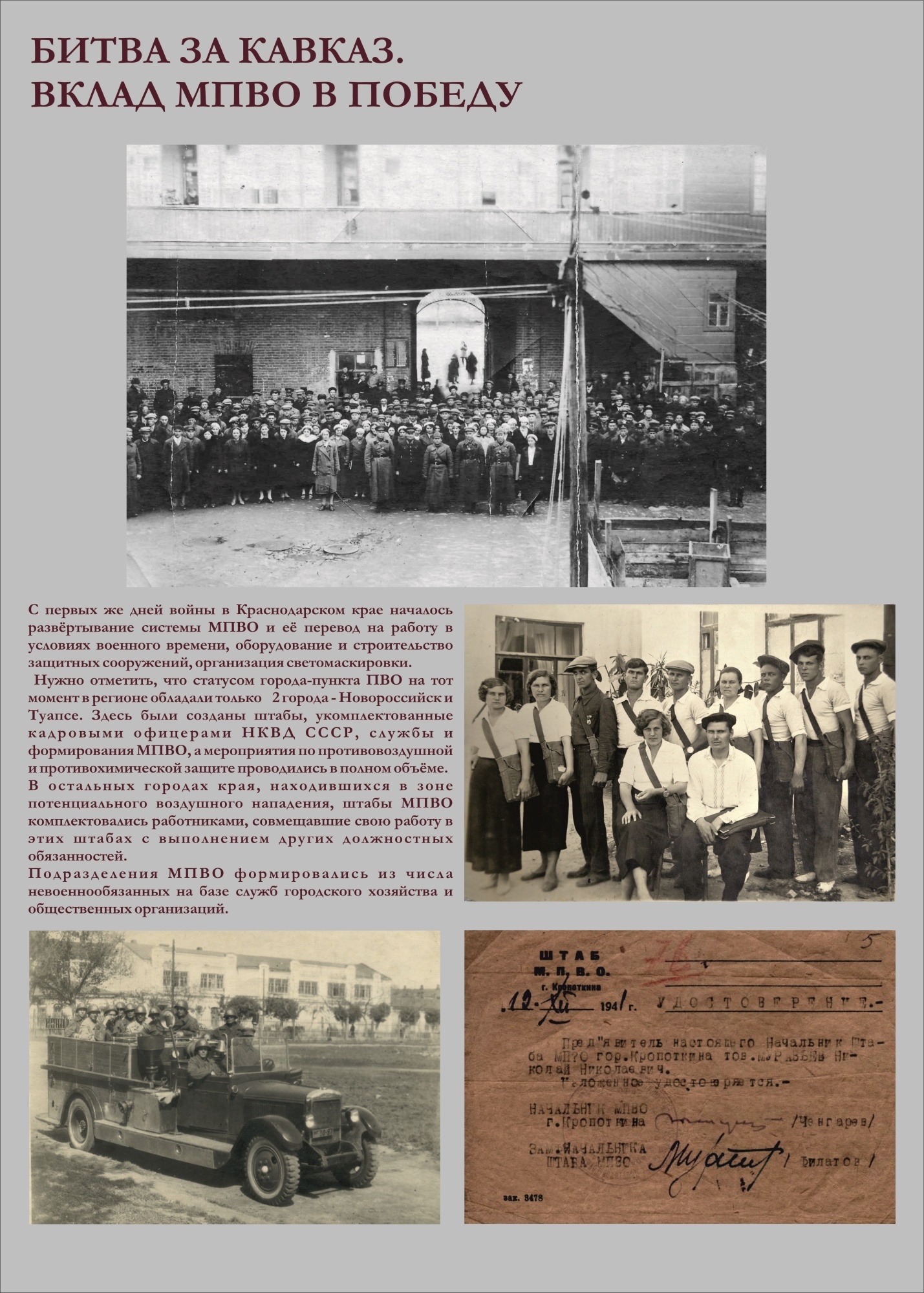 Экспозиция «Битва за Кавказ. Вклад МПВО в Победу», посвященная героизму бойцов пожарной охраны и формирований МПВО Краснодарского края, сейчас активно используется для просвещения населения. В частности, стенды в электронном виде демонстрируются школьникам в рамках открытых уроков культуры безопасности. А сотрудники выставки продолжают научно-исследовательскую работу для выявления новых фактов истории подразделений МПВО на Кубани для дальнейшего расширения экспозиции.