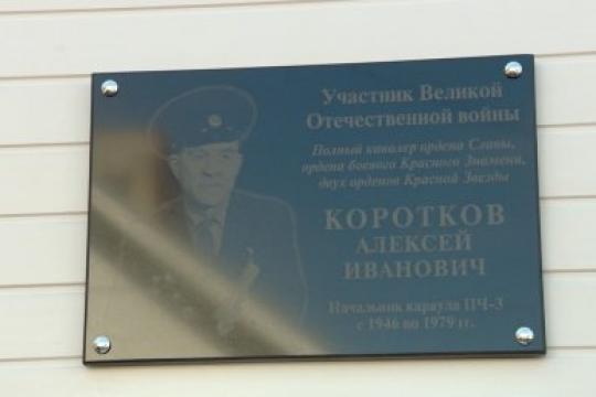 Надпись на доске: "Участник Великой Отечественной войны, полный кавалер ордена Славы, ордена боевого Красного Знамени, двух орденов Красной Звезды Коротков Алексей Иванович, начальник караула ПЧ-3 с 1946 по 1979 гг."