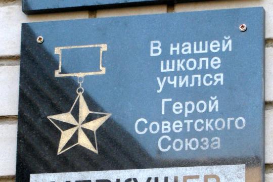Текст: «В нашей школе учился Герой Советского Союза Меркушев Александр Максимович, пехотинец. Установлена Российским военно-историческим обществом».