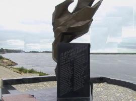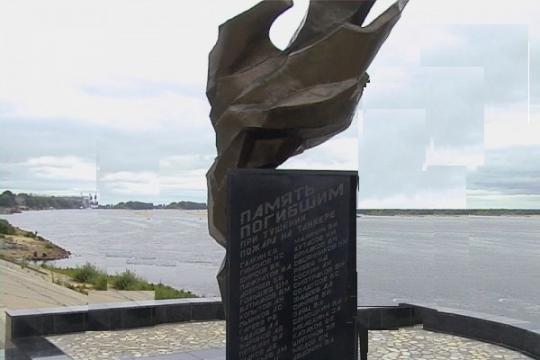 На берегу, точнее обрыве, где случилась трагедия, у причала нефтебазы установлен также обелиск. Памятный знак, на котором начертаны имена погибших. Он изображает вырывающееся пламя.