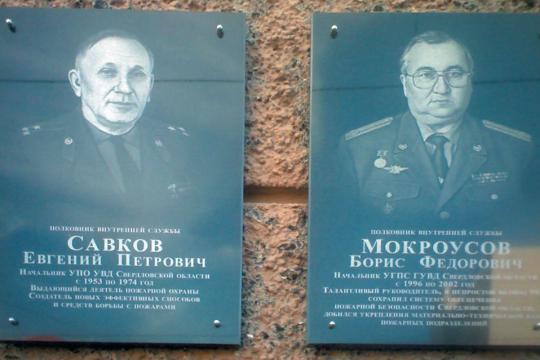 30 апреля 2011 г. в Главном управлении МЧС России по Свердловской области состоялся торжественный митинг, посвященный 362-й годовщине со дня образования пожарной охраны России и открытию мемориальных досок памяти бывших руководителей Управления противопожарной службы Свердловской области – выдающегося деятеля пожарной охраны полковника внутренней службы Савкова Евгения Петровича и талантливого руководителя полковника внутренней службы Мокроусова Бориса Федоровича.