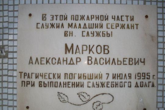 Посвящена памяти младшего сержанта внутренней службы Маркова Александра Васильевича, пожарного 7-й пожарной части, погибшего 07.07.1995 г. при тушении пожара в 10-этажном жилом доме.