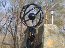 Сам памятник символичен: на огромном уральском камне (монолит вулканической породы весом 35 тонн) красуется модель атома.