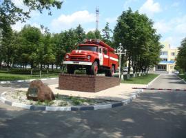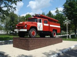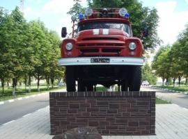 Постамент с пожарным автомобилем, символизирующий ратный труд пожарных и спасателей Белгородской области «Во славу огнеборцев земли Белгородской»