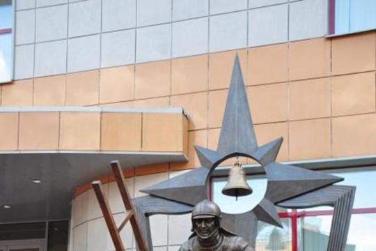 На заднем плане скульптурной композиции можно видеть очертания РАСКРЫТОЙ КНИГИ - символа знаний, которые постигаются в учебном заведении. В центре раскрытой книги, возвышаясь над фигурой пожарного, расположен основной символ МЧС России – ЗВЕЗДА НАДЕЖДЫ И СПАСЕНИЯ, означающая, что спасатели готовы оказать помощь в любой точке мира в любое время.