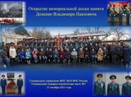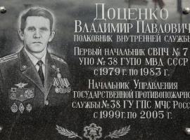 На здании пожарного депо специальной пожарно-спасательной части №7 Специального управления ФПС №38 МЧС России 16.10.2015 года была открыта мемориальная доска памяти Доценко Владимира Павловича, бывшего начальника управления.